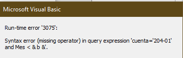 me.recordsource="select * from Movimientos where cuenta='" & me.cuenta & "' and month([fechamov])= [Escriba un mes] and year([fechamov])=[Escriba un año]"