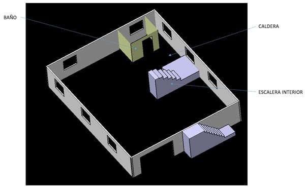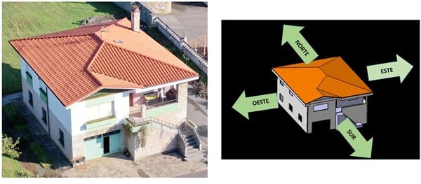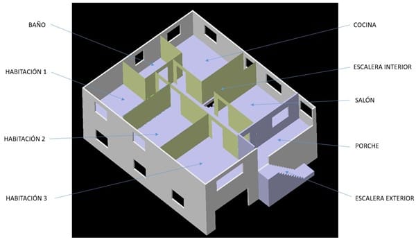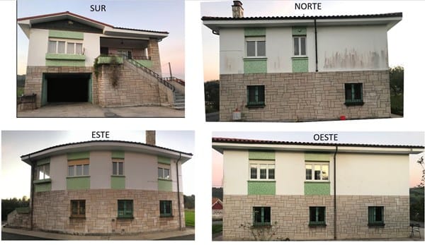 Se trata de una vivienda unifamiliar en Asturias, cerca de la costa, de planta rectángular 12x10m y dos plantas, la inferior destinada a garaje, aperos, caldera, lavadero, sin tabiques, suelo de hormigón, portón de 3m de ancho de madera (con grandes ranuras) y ventanas de madera con simple cristal con 60 años de antigüedad (al igual que el portón con grandes ranuras). La planta superior está dedicada a vivienda, distribuida en 3 hab, 1 baño, salón y cocina, con ventanas de de pvc de doble cristal, 2 habitaciones presetan suelo de madera.