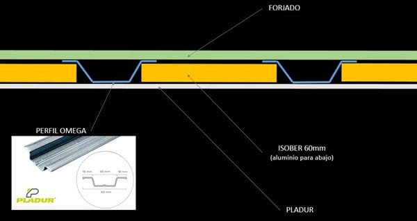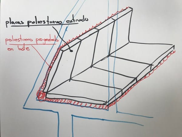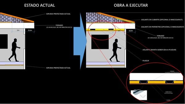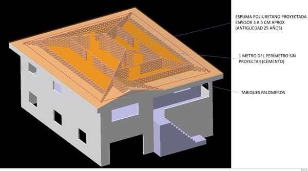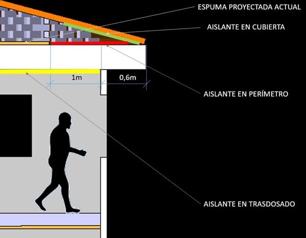 La buhardilla no ha sido proyectada en su totalidad, 1m de todo el perímetro no ha sido aislado por estar tras un tabique palomero y ser de difícil acceso (en realidad creo que por pereza de los operarios). He realizado mediciones con termómetro infrarojo en los techos de la vivienda y justo donde acaba el aislante de poliuretano la temperatura cae de 1° a 2°, en especial en las habitaciones norte, por lo que me he animado a disponer en el suelo de la buhardilla rollos de aislante de fibra de vidrio isober que cubran ese metro que falta por aislar. Por lo angosto del hueco, me está siendo de gran dificultad y estoy planteándome otros métodos de aislamiento, como pueden ser botes de espuma proyectable "penosil" que salen bien de precio y con los que podría completar la zona no aislada y 1 metro del perímetro de la cubierta, (he visto el análisis térmico teórico de una vivienda con alero y parece que ambas zonas son de importancia). También me estoy planteando bajar los techos del piso superior, actualmente sin bajar, con listones, fibra de vidrio isober y paneles de pladur.