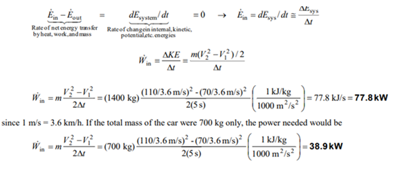 Considere un automóvil de 1400 kg que viaja a una velocidad constante de 70 km/s. Ahora el automóvil comienza a rebasar a otro, acelerando a 110 km/h en 5s. Determine la potencia adicional necesaria para alcanzar esta aceleración. ¿Cuál sería su respuesta si la masa total del automóvil fuera de tan solo 700kg?