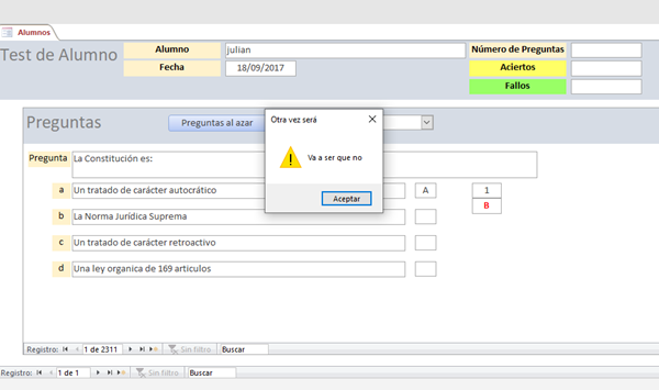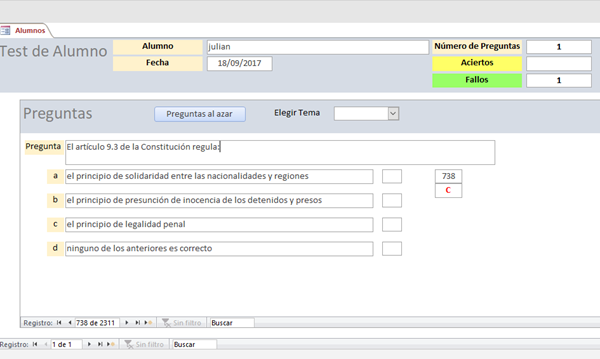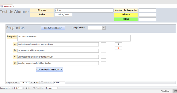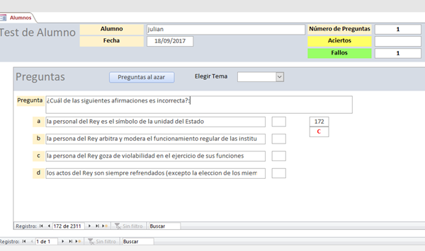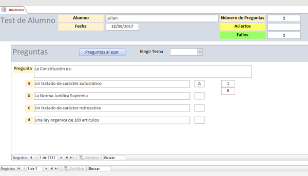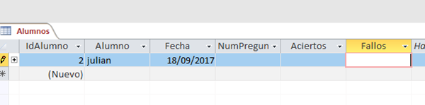 Me pone en los cuadros de texto del formulario las preguntas respondidas por cada alumno, los aciertos y los fallos, que se guardan en la tabla, en el registro de ese alumno. También en la tabla Test por si hiciera más de uno.