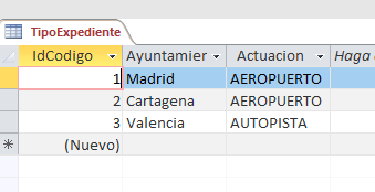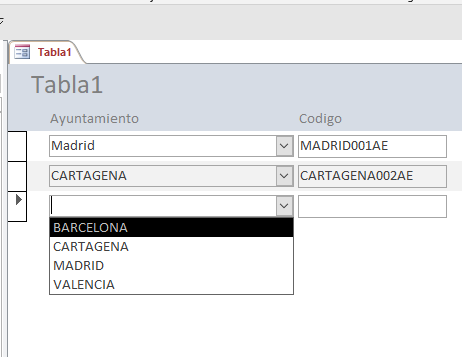 Lo que quiero armar ahora es un formulario que me extraiga los ayuntamientos de la tabla 'Ayuntamientos' para que yo seleccione el que desee a través de un desplegable. Y una vez seleccionado cualquiera de esos tres ayuntamientos, me recorra la tabla 'TipodeExpediente' para que me vea que tipo de actuación tiene asociado y me arroje en un campo nuevo de ese formulario, un código.