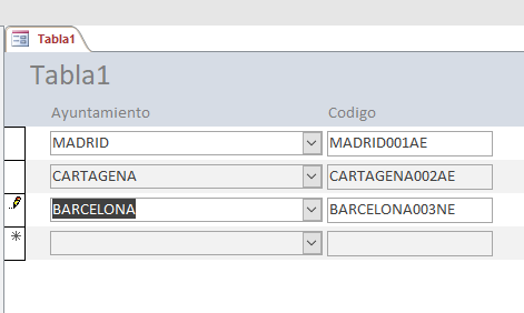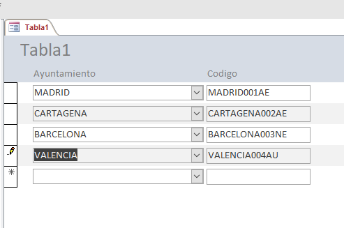 a tod@s. Os cuento mi problema. Estoy trabajando en una base de datos Access en la que hay una tabla llamada 'Ayuntamientos' que tiene dos campos: