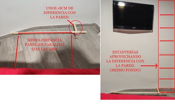 El panel iría en una pared que tiene cierto ángulo, con lo cual, actualmente la TV que tengo de 32" no queda totalmente frontal, en paralelo con los pies de la cama. Adjunto fotos para mejor explicación.