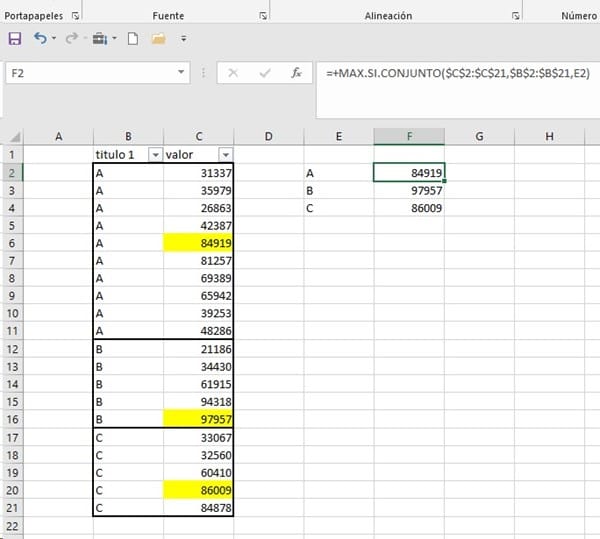 Necesito realizar una búsqueda del valor buscando en la columna A y obtener el resultado B que tiene el mayor valor.