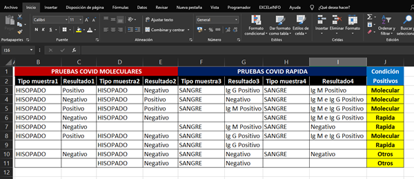 Ojala me puedan ayuda de como hacer una fórmula para llegar como resultado en condición de positivos, la base de datos que tengo consiste en pruebas de COVI-19 la cual son dos, las moleculares (Hisopado) y las rápidas (Sangre), el cuadro que muestro tiene para 2 pruebas moleculares y 2 pruebas rápidas lo cual serian 4 resultados, el detalle es que, quiero que me aparezca como resultado en la condición positivos evaluando los 4 resultados teniendo como condición, que si en los 4 tipo de resultados basta que uno de ellos sea positivo por HISOPADO me de como resultado Molecular y si los HISOPADOS son negativos y basta que uno de las muestras de sangre sea positivo me de como resultado Rápida y si no encuentra ninguna postivo en los 4 resultados que me devuelva vacio.