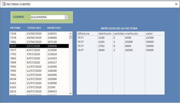 Un formulario que me presente una lista desplegable con todos los clientes. Según yo seleccione el nombre en cuestión, me muestre los campos Dirección de la tabla "Clientes" pero que además lo relacione con la tabla "Facturas" y según ese IDCliente de la tabla "Clientes" me muestre los datos de la tabla Facturas de ese cliente, como son el artículo o artículos que haya comprado y el precio de cada artículo.