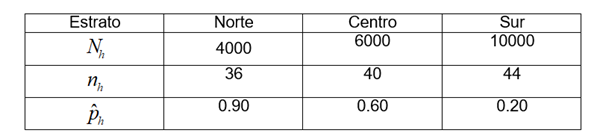 Ejemplo 2. En la tabla siguiente la información correspondiente al gasto a la proporción de familias que pose por lo menos un carro de una muestra aleatoria estratificada simple de 120 familias en una cuidad geográficamente dividida en tres estratos: Norte, Centro y Sur.