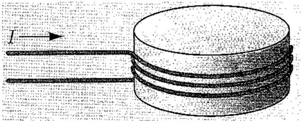 3) Una bobina circular tiene 60 vueltas de alambre devanado en torno a la periferia d un disco de madera de 0.15 m de radio (ver figura). Si por la bobina pasa una corriente de 2 A. ¿Cuál es el campo magnético que se produce en el centro del disco?