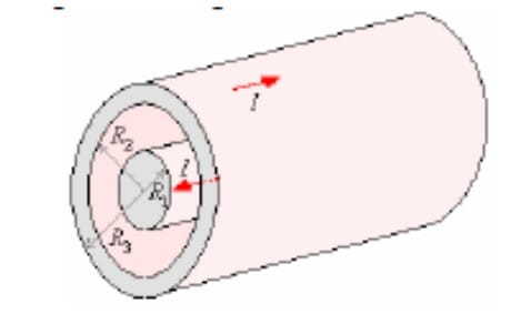 2) Se tiene un cable coaxial, tal como se muestra en la figura. Calcular el campo magnético para todo punto. a) r<R1, b) R1, c) R1<r<R2, d) R2<r<R3 y e) R3<r
