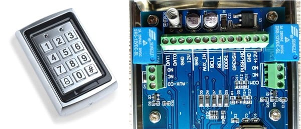 Y quiero conectarle este teclado de control de acceso que se alimenta de una fuente de 12 voltios en continua: