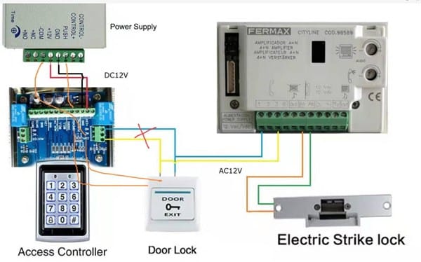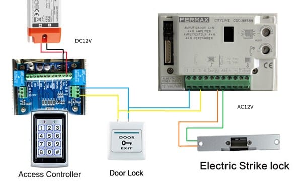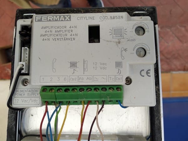 Tengo un portero electrónico de la marca Fermax que funciona con 12 voltios en alterna y tiene un pulsador de salida que abre una cerradura de portal normal.