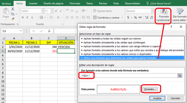 Necesito una formula o una macro para aplicar una formato a una celda dependiendo de si la de la derecha esta vacía o no, es decir si la celda de la derecha no tiene datos entonces se pinta de un color el texto de la celda anterior. Este formato debo aplicarlo en varias filas de una tabla.