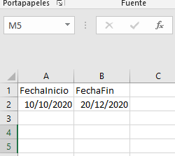 Excel: En B1 tengo la fecha inicial y B2 la fecha final, ejecuto la macro y todo bien