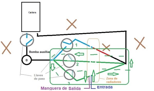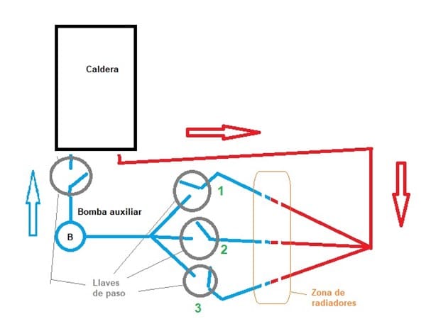 Incluso si cierro el circuito 1, que es el que “funciona”. La caldera trabaja, la bomba auxiliar trabaja pero no llega calor a ningún radiador. La caldera coge temperatura pero para rápidamente como ya intuís algunos.