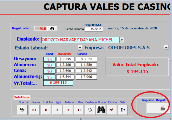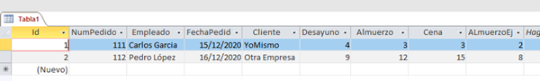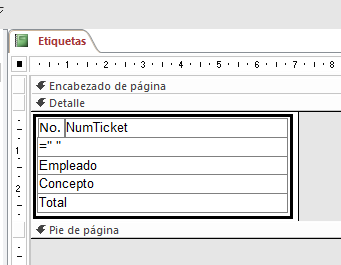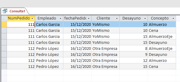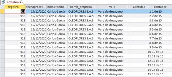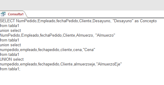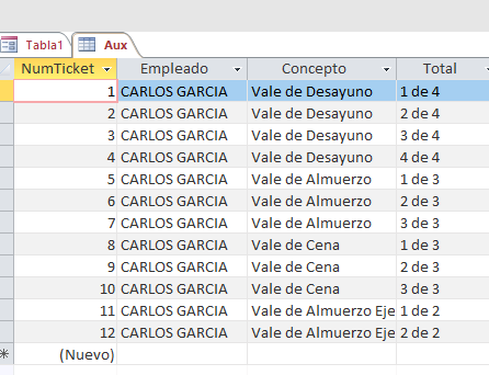 DoCmd.RunSQL "insert into aux(empleado,concepto,total)values(empleado,""Vale de Almuerzo""," & i & " & "" de "" & almuerzo)"