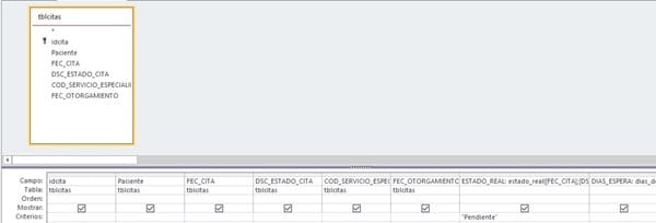 Option Compare Database Option Explicit Public f_corte As Date Public Function estado_real(dfecha_cita As Date, strEstado As String, lnCodServicio As Integer) As String ' Utiliza la variable publica f_corte, correspondiente a la fecha de corte ' del formulario frm_Menu If (strEstado = "Cancelada" Or _ strEstado = "Presente" Or _ strEstado = "Ausente" Or _ strEstado = "Reprogramada" Or _ strEstado = "RESUELTO") And _ (lnCodServicio = 998 Or _ lnCodServicio = 999 Or _ lnCodServicio = 0) Then estado_real = "Resuelto" ElseIf dfecha_cita <= f_corte And _ strEstado = "Otorgada" And lnCodServicio = 998 Then estado_real = "Resuelto" ElseIf lnCodServicio = 999 And _ strEstado = "Cancelada" Then estado_real = "Resuelto" Else estado_real = "Pendiente" End If End Function