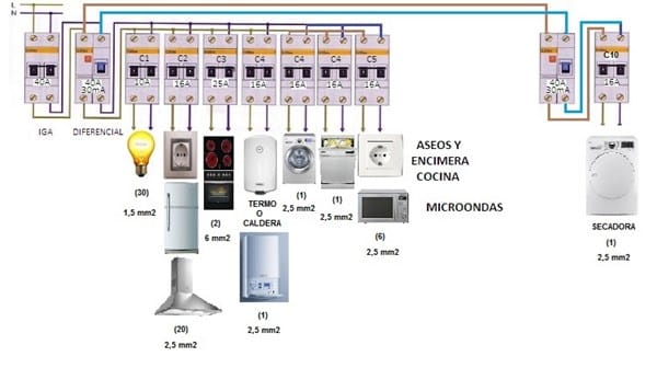 No obstante, puedes configurar eso mismo en el cuadro principal sin tener que realizar el cuadro secundario. El reglamento permite aumentar los circuitos C1, C2 y C5 si hay en la vivienda más de 30 puntos de luz, más de 20 enchufes generales o más de 6 enchufes húmedos (baños y encimera). También se puede desdoblar cada circuito, es decir, por ejemplo se pueden instalar dos C1 de 10A que atiendan 15 puntos de luz cada uno (uno para cada planta).