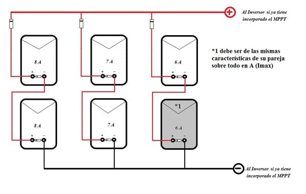El esquema perfecto mi idea es comprar otra placa solar y poner seis placas lo que no veo bien es la referencia de los diodos, al poner un inversor mppt no hace falta regulador de carga a ver si me puede explicar esto. Un saludo