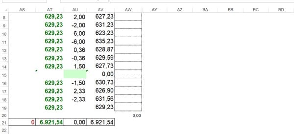 Necesito ayuda por favor según en la imagen en la columna AU tengo que poner manualmente números negativos y positivos de 1 a 10 que sumen cero de forma que los datos en la columna AV me varíen y no sean siempre la misma cantidad pero que la suma sea siempre la misma lo hago a mano y son muchas fichas y cantidades parecidas por eso busco ayuda a ver si puedo conseguir que en la columna por ejemplo AZ se me generan unos números de 1 a 10 negativos y positivos once números que sumen cero para copiarlos y pegarlos en la columna AU dejando la fila 15 sin poner nada, espero haberlo explicado bien adjunto imagen. Muchas Gracias