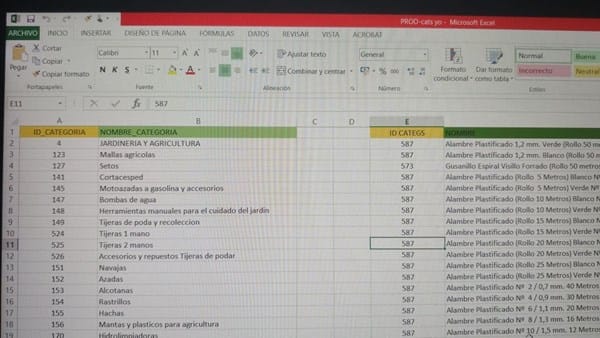 En otra fila tengo el nombre de las categorías en las que se deben organizar esos productos. Al lado de esta fila tengo el ID de las categorías cuyo valor es un número.