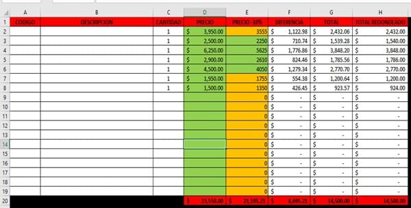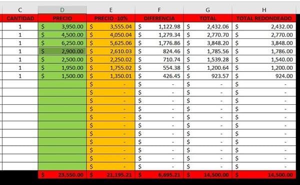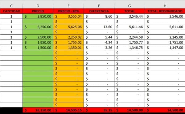 En esta imagen ya borre las cantidades y se ve que el precio menos el 10% bajo hasta 14,535.15 y lo que necesito es que llegue a 14,500 son 35.15 la diferencia entonces no hay problema el chiste es que la cantidad quede lo más cercano. Espero haberme dado a entender. Muchas gracias y feliz año!