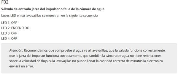 Desde hace tiempo el lavavajillas hace mucho ruido y cuando acaba de limpiar aparece el fallo f02 y se queda un ruido como si intentase arrancar una bomba continuamente. He visto en internet que puede ser una válvula de entrada jarra del impulsor o fallo de la cámara de agua. No se si podrá ser por suciedad. A ver si alguien me puede ayudar.
