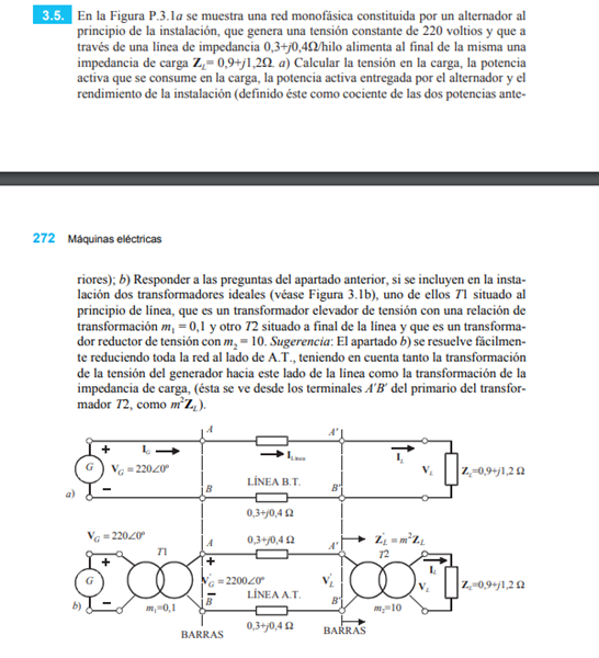 En la Figura P.3.1a se muestra una red monofásica constituida por un alternador al principio de la instalación, que genera una tensión constante de 220 voltios y que a través de una línea de impedancia 0,3+j0, 4L/hilo alimenta al final de la misma una impedancia de carga ZL= 0,9+j1, 2L. A) Calcular la tensión en la carga, la potencia activa que se consume en la carga, la potencia activa entregada por el alternador y el rendimiento de la instalación (definido éste como cociente de las dos potencias anteTransformadores 271 riores); b) Responder a las preguntas del apartado anterior, si se incluyen en la instalación dos transformadores ideales (véase Figura 3.1b), uno de ellos T1 situado al principio de línea, que es un transformador elevador de tensión con una relación de transformación m1 = 0,1 y otro T2 situado a final de la línea y que es un transformador reductor de tensión con m2 = 10. Sugerencia: El apartado b) se resuelve fácilmente reduciendo toda la red al lado de A.T., teniendo en cuenta tanto la transformación de la tensión del generador hacia este lado de la línea como la transformación de la impedancia de carga, (ésta se ve desde los terminales AñBñ del primario del transformador T2, como m2 ZL)