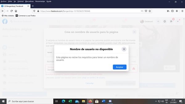 Aacabo de abrir una nueva página en facebook pero no me deja crear un nombre de usuario, ya he intentantado reiteredas veces ¿por qué puede ser?