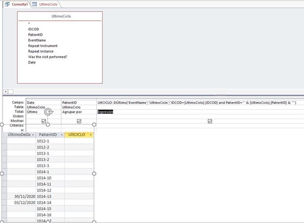 Es una tabla sencilla con 3 variables (Codigo paciente, Ciclo y Fecha de ciclo), pero no consigo que me aparezca 1 fila por paciente con su último ciclo.