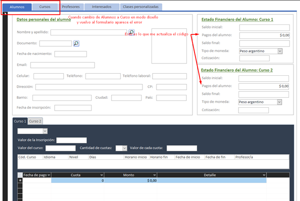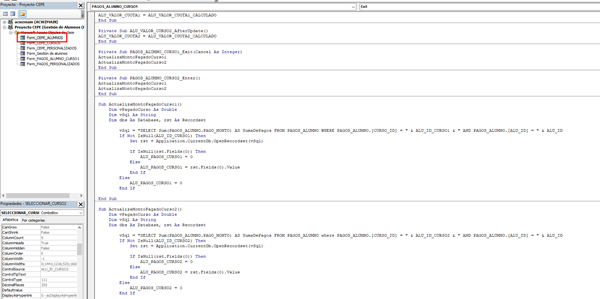 Sub ActualizaMontoPagadoCurso1() Dim vPagadoCurso As Double Dim vSql As String Dim dbs As Database, rst As Recordset vSql = "SELECT Sum(PAGOS_ALUMNO.PAGO_MONTO) AS SumaDePagos FROM PAGOS_ALUMNO WHERE PAGOS_ALUMNO.[CURSO_ID] = " & ALU_ID_CURSO1 & " AND PAGOS_ALUMNO.[ALU_ID] = " & ALU_ID If Not IsNull(ALU_ID_CURSO1) Then Set rst = Application.CurrentDb.OpenRecordset(vSql) If IsNull(rst.Fields(0)) Then ALU_PAGOS_CURSO1 = 0 Else ALU_PAGOS_CURSO1 = rst.Fields(0).Value End If Else ALU_PAGOS_CURSO1 = 0 End If End Sub Sub ActualizaMontoPagadoCurso2() Dim vPagadoCurso As Double Dim vSql As String Dim dbs As Database, rst As Recordset vSql = "SELECT Sum(PAGOS_ALUMNO.PAGO_MONTO) AS SumaDePagos FROM PAGOS_ALUMNO where PAGOS_ALUMNO.[CURSO_ID] = " & ALU_ID_CURSO2 & " AND PAGOS_ALUMNO.[ALU_ID] = " & ALU_ID If Not IsNull(ALU_ID_CURSO2) Then Set rst = Application.CurrentDb.OpenRecordset(vSql) If IsNull(rst.Fields(0)) Then ALU_PAGOS_CURSO2 = 0 Else ALU_PAGOS_CURSO2 = rst.Fields(0).Value End If Else ALU_PAGOS_CURSO2 = 0 End If End Sub
