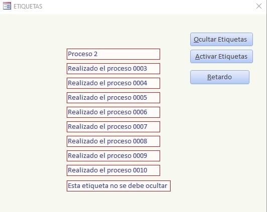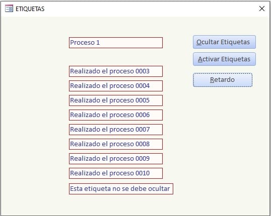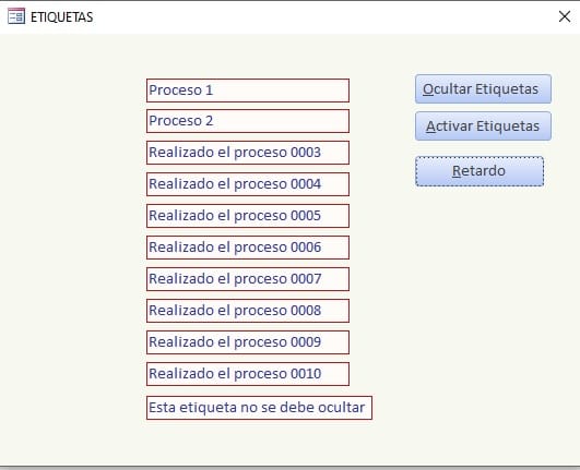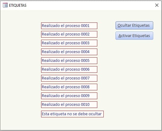 Tengo un formulario con una docena de etiquetas ("Realizado el proceso XXXX") con la propiedad visible en false.