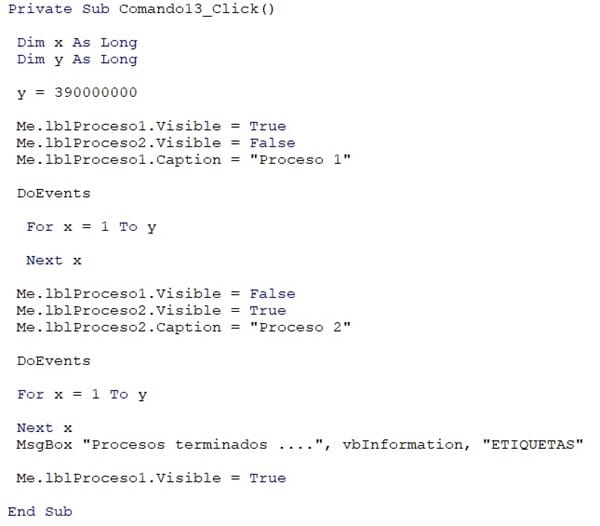 En el evento cargar del formulario se realizan otros tantos procesos y la idea es que la etiqueta correspondiente se vea cuando el proceso al que hace referencia esté finalizado para lo que pongo su propiedad visible en true.