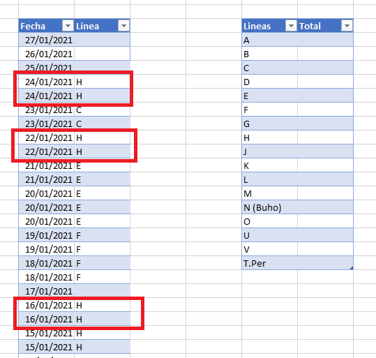 Lo que quisiera es sumar en la tabla de la derecha cuantas veces estuve en cada línea pero discriminando la fechas repetida, como se puede ver en la imagen se observa que hay varias veces la misma fecha por cuestiones de horarios pero en realidad solo es una vez y no se como discrimar eso en una función si.