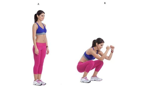 Luego 25 a 50 sentadillas manteniendo culo apretado, espalda recta, brazos de frente y dedos cruzados de las manos.