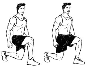 Luego realizar ejercicio zancada fija con elevación de mancuerna, 12 elevaciones levantando un brazo y luego el otro, y luego bajando un brazo y luego el otro, luego cambio de pierna, y 12 elevaciones, No recomiendo poleas elásticas, pues estas siempre causan accidentes en lingamentos, debido a la mala calidad de las mismas en muchos sitios, es más seguro usar mancuernas.