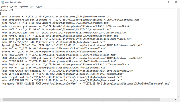 Tengo el siguiente bat y toda mi información que describe el archivo se guarda con mi nombre de usuario, pero quiero cambiar el nombre de usuario por la IP de mi equipo, este mismo archivo lo quiero usar en varias computadoras
