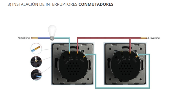 Además, este tipo de conmutadores tiene un esquema de funcionamiento distinto del de los conmutadores mecánicos clásicos. Ya que en los que tengo ahora mismo cada uno de los conmutadores lleva los tres cables y en los wifi, uno llevaría los tres y el otro solo el que conmuta y la fase de entrada (imagen adjunta)