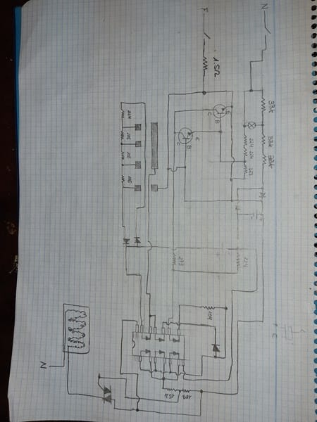 Tengo una manta eléctrica, de estas que la conectas a la red y con un "Mando deslizador" calienta más o menos en función de que número hayas seleccionado, hace unos días dejo de funcionar, al día siguiente se me ocurría volverlo a encender y si que funcionaba hasta que dejo de funcionar, el tema es que lo desmonté y y medi tensiones conectado a red, tensiones en el integrado condensadores etc.. Y si que funcionaba correctamente, en la posicion 1 sacaba tension oscilante 30V 40V 55V 30V 40V 55V consecutivos, en la posicion "2" 100v 130v 160v oscilantes, en la posicion "3" 230v 0 230v 0 oscilantes y en la posicion 4 230V FIJOS, y dije, anda, pues ahora si que funciona, tambien lleva un piloto indicador en el que se enciende nadamas conectar la manta, ahora todo funcionaba correcto menos el piloto "Neón" sin volverlo a montar lo desoldé para conectarlo a la red con una resistencia de 100.000K para probar si estaba mal, y para mi sorpresa si que lucía, el tema es que en la placa si que le llegan 75V a los pines pero lo conecto y no prende, el neón con 75V debería de prender, el tema es que me dio un poco igual porque la manda ya calentaba, pero para mis sorpresa ya volvio a dejar de funcionar despues de ponerme a desoldar el piloto, HE REVISADO TODAS LAS RESISTENCIAS SMD DEL CIRCUITO, LOS CONDENSADORES LOS DIODOS SMD EL ZENER, Y SOSPECHO YA DEL INTEGRADO, el tema es que antes llegaban 8V de alimentacion al integrado y ahora llegan 1,75V, y he revisado la placa de arriba hasta abajo, aunque me haga sospechar del integrado, mis preguntas son: ¿Por qué el piloto "NEÓN" no luce aun teniendo 75V en sus pines, y porque no le llegan 8V al integrado? EL INTEGRADO ES UN HEF40106B (Trigger Schmitt) conmuta a un TRIAC para hacer la oscilacion o eso creo, He hecho el esquema de conexiones en un papel para que le hecheis un ojo, también os paso unas fotos de como es la placa.
