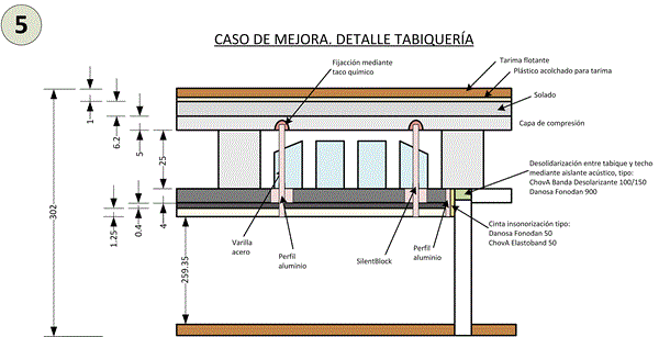 ¿Pregunta sobre desolidarización de tabiques? No me ha quedado claro si es aconsejable abrir una pequeña franja a lo largo del tabique que separa el salón y el dormitorio de matrimonio para que el tabique no toque la viga superior, ver Fig. 5. Como se observa, esta franja permite introducir una banda desolidarizarte tipo CHOVA BANDA DESOLIDARIZANTE 100/500. Creo que esta medida permitiría reducir la transmisión de ruido de una habitación a otra.