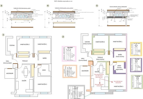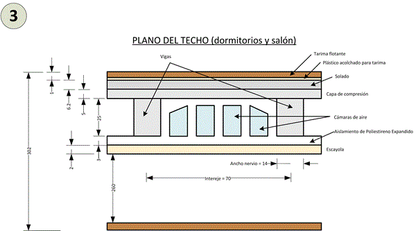 Planteamiento del problema. Mi vecino del piso superior, cuando se reúne con tres o cuatro personas y elevan el tono de voz o ser ríen de forma descontrolada, generan ruido aéreo que se transmite a mi salón y a la habitación N.º. 3 (dormitorio de matrimonio). Es curioso porque sólo es ruido aéreo procedente de sus voces. No escucho su televisión u otros ruidos (como otros casos planteados en el foro). Eso sí, el suelo, al ser de tarima flotante, transmite el ruido de impacto del calzado. Este problema no me preocupa porque mi vecino en este sentido es bastante silencioso y usa zapato con suela acolchada para estar por casa. El problema es básicamente el ruido aéreo que en el silencio de la noche se percibe mucho más.