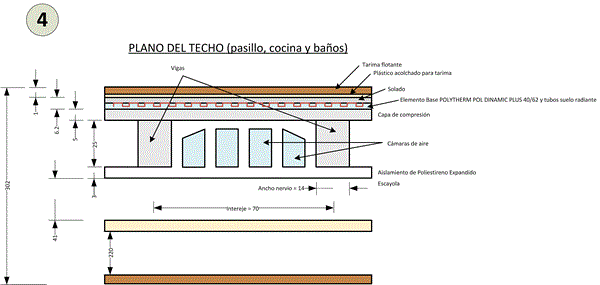 Como es el techo de mi vivienda. El techo está formado por bovedillas de poliestireno que descansan sobre las vigas de hormigón. Sobre las bovedillas del salón y los tres dormitorios descansa inmediatamente la placa de escayola, ver Fig. 3.