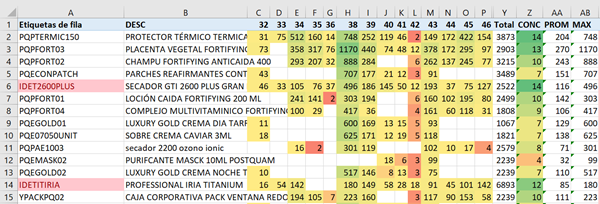 Columna A, referencia, columna B, descripción, de la C a la P semanas del año con el valor de salidas. Columna Y es la suma de las anteriores, columna Z, cuantas de las anteriores 14 semanas han tenido venta, columa AA es el valor promedio de venta por semana y AB la cantidad máxima vendida.