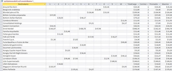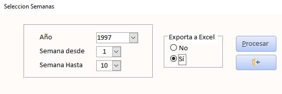 Como se observa se elige el año y el rango de semanas a procesar. La información de toma de una tabla de pedidos (En este caso tomé la de Neptuno). El ejemplo lo hago con 10 semanas por falta de espacio para las imágenes. Al hacer clic sobre el botón Procesar estando activado el botón "Exporta a Excel" en Si se genera la consulta y se guarda el archivo de Excel.