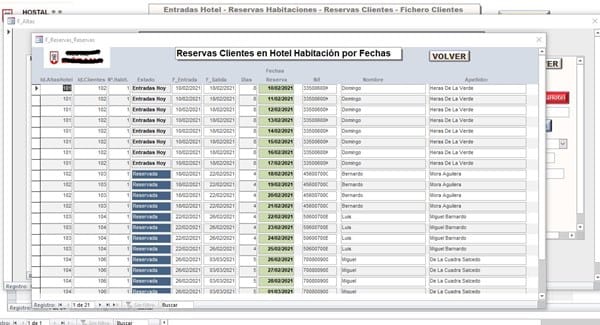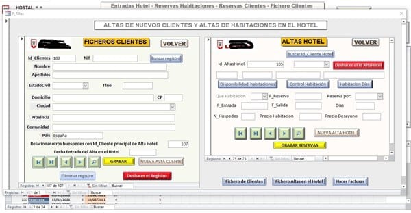 Mediante estos formulario doy de alta a los clientes y las entradas y pinchando el botón de Grabar Reservas, me realiza un DoCmd. RunSQL "insert into T_Reservas y paso a la Tabla de Reservas, una por una los días que hay entre la Fecha de Salida y Fecha de Entrada del nuevo registro.