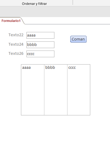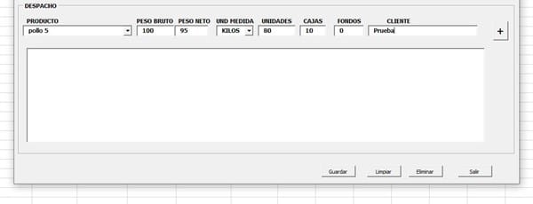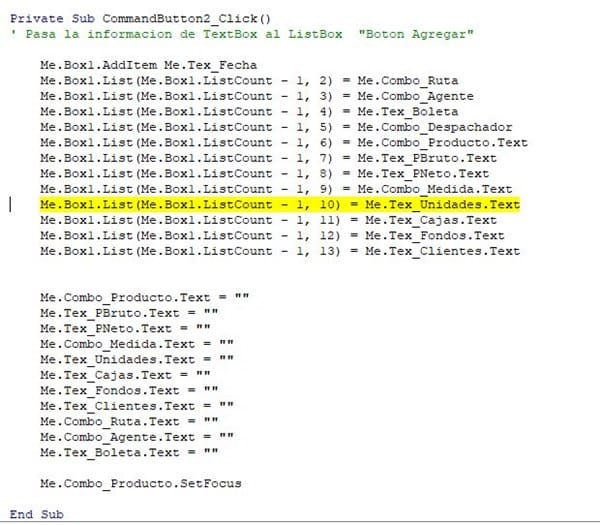 Private Sub CommandButton2_Click() ' Pasa la informacion de TextBox al ListBox "Boton Agregar" Me.Box1.AddItem Me.Tex_Fecha Me.Box1.List(Me.Box1.ListCount - 1, 2) = Me.Combo_Ruta Me.Box1.List(Me.Box1.ListCount - 1, 3) = Me.Combo_Agente Me.Box1.List(Me.Box1.ListCount - 1, 4) = Me.Tex_Boleta Me.Box1.List(Me.Box1.ListCount - 1, 5) = Me.Combo_Despachador Me.Box1.List(Me.Box1.ListCount - 1, 6) = Me.Combo_Producto.Text Me.Box1.List(Me.Box1.ListCount - 1, 7) = Me.Tex_PBruto.Text Me.Box1.List(Me.Box1.ListCount - 1, 8) = Me.Tex_PNeto.Text Me.Box1.List(Me.Box1.ListCount - 1, 9) = Me.Combo_Medida.Text Me.Box1.List(Me.Box1.ListCount - 1, 10) = Me.Tex_Unidades.Text Me.Box1.List(Me.Box1.ListCount - 1, 11) = Me.Tex_Cajas.Text Me.Box1.List(Me.Box1.ListCount - 1, 12) = Me.Tex_Fondos.Text Me.Box1.List(Me.Box1.ListCount - 1, 13) = Me.Tex_Clientes.Text Me.Combo_Producto.Text = "" Me.Tex_PBruto.Text = "" Me.Tex_PNeto.Text = "" Me.Combo_Medida.Text = "" Me.Tex_Unidades.Text = "" Me.Tex_Cajas.Text = "" Me.Tex_Fondos.Text = "" Me.Tex_Clientes.Text = "" Me.Combo_Ruta.Text = "" Me.Combo_Agente.Text = "" Me.Tex_Boleta.Text = "" Me.Combo_Producto.SetFocus End Sub Private Sub BTN_GUARDAR_Click() Dim I As Integer Dim Pd As Long ' Se crea un With para que haga el proceso de buscar los datos y paslos a la hoja de excel, se repite en cada linea. With Hoja1 Pd = .Range("A" & Rows.Count).End(xlUp).Row + 1 For I = 0 To Box1.ListCount - 1 .Range("A" & Pd) = Box1.List(I, 0) .Range("B" & Pd) = Box1.List(I, 1) .Range("C" & Pd) = Box1.List(I, 2) .Range("D" & Pd) = Box1.List(I, 3) .Range("E" & Pd) = Box1.List(I, 4) .Range("F" & Pd) = Box1.List(I, 5) .Range("A" & Pd) = Box1.List(I, 6) .Range("A" & Pd) = Box1.List(I, 7) .Range("A" & Pd) = Box1.List(I, 8) .Range("A" & Pd) = Box1.List(I, 9) .Range("A" & Pd) = Box1.List(I, 10) .Range("A" & Pd) = Box1.List(I, 11) .Range("A" & Pd) = Box1.List(I, 12) Pd = Pd + 1 Next I ' El Next hace que se repita la accion en todas las lineas. End With ' Limpia el ListBox Box1.Clear End Sub Private Sub UserForm_Initialize() ' Carga la cantidad y tamaño de las columnas With Box1 .ColumnCount = 13 .ColumnWidths = "45 pt;40 pt; 40 pt; 40 pt;155 pt;155 pt;40 pt;40 pt;40 pt;60 pt;40 pt;40 pt;155 pt; " End With End Sub