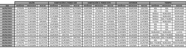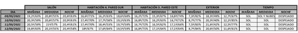 Toma las lecturas de los cuatro puntos durante 15 días consecutivos a las 9 de la mañana, las 3 de la tarde y las 10 de la noche. Señala si aquel día fue soleado, nublado o lluvioso y, en el caso de los sensores interiores indica si teníais los radiadores prendidos o no. Prepara un cuadro en donde aparezcan todos estos datos.
