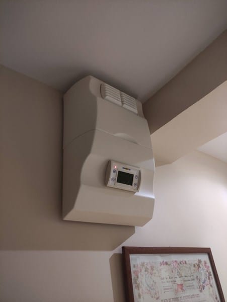 Tras ponerme en contacto con una empresa especialista en humedades y tomar datos como temperatura y humedad, nos indicaron que la solución a ello sería la colocación de un aparato (llamado CTA) en casa que se encarga de recoger aire del exterior, precalentarlo e introducirlo en casa. Con este aparato se terminaría todo problema de humedad por condensación. Para la expulsión del aire "viciado" o húmedo, nos ponían unas rejillas en las tapas de los bombos de las persianas, y nos cepillarían las puertas de las habitaciones para que se pudiera mover el aire y con eso nos garantizaban que la humedad desaparecería y estaría en unos niveles óptimos para la salud humana. Dicho aparato estaría conectado las 24 horas del día.