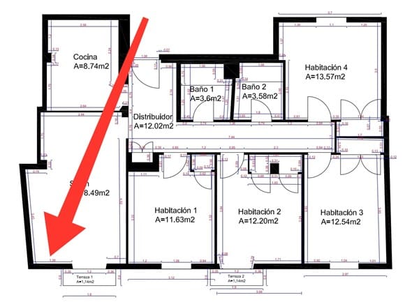 Te adjunto imagen del plano de la vivienda. Ahora mismo no estoy en casa y lo único que he podido sacar como imagen es una capturada de google. Mi piso es el segundo que se ve arriba con dos ventanas y dos balcones (uno de ellos tapado). Luego hay otra ventana que da a la otra orientación pero no puedo sacarla por Google ahora mismo.