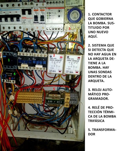 Si pulso el interruptor de puesta en marcha, no arranca. No hace nada. Hay un contactor que gobierna a la bomba, que si pulso su botón que tiene en el centro, arranca la bomba, ... Pero no puedo estar todo el día con el dedo puesto en el interruptor para que ande !